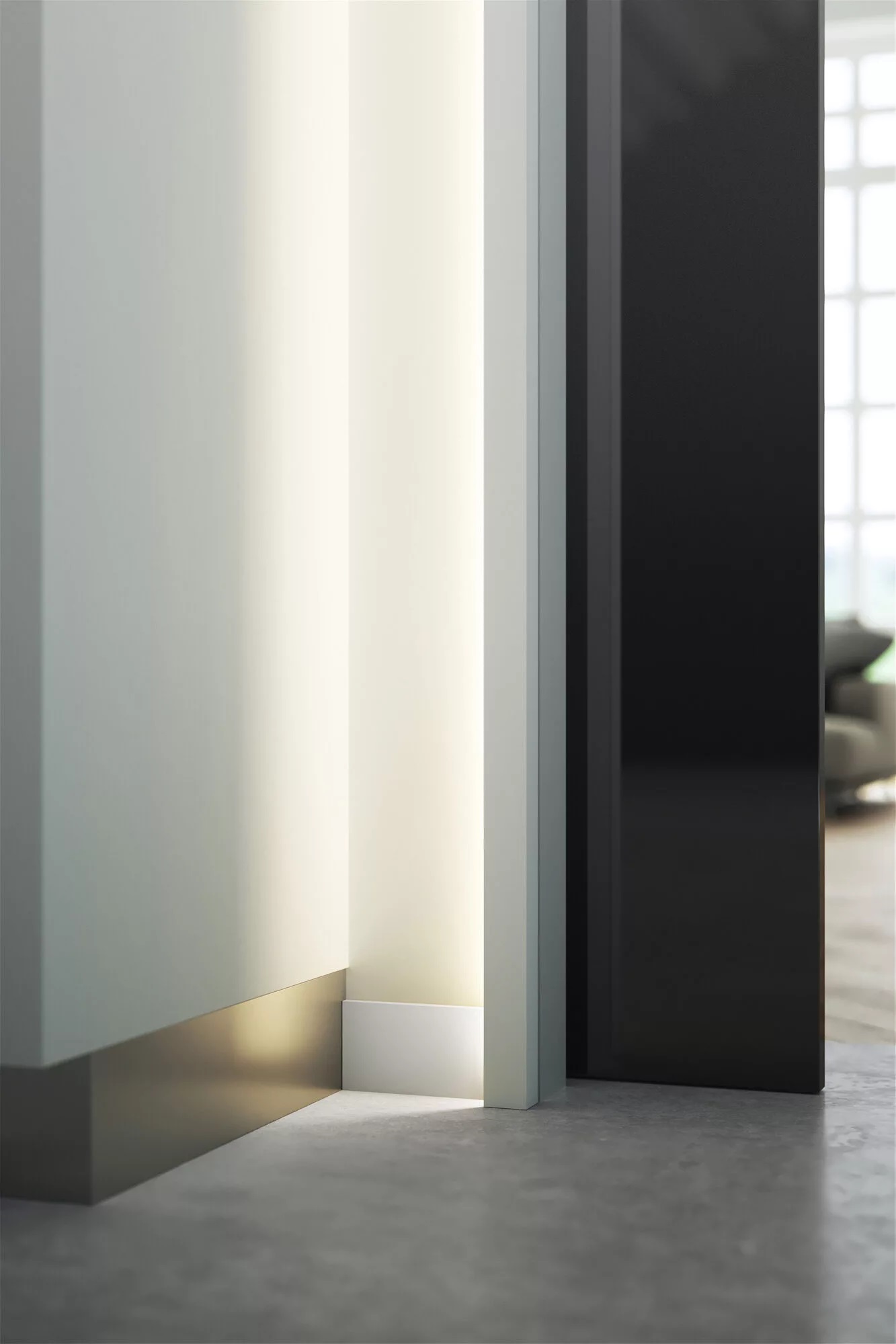Ponadto, ten rodzaj oświetlenia może służyć jako alternatywa dla tradycyjnych kinkietów lub opraw sufitowych. Listwy umieszczone wzdłuż ściany stworzą równomierne i przyjemne oświetlenie, które pomoże w stworzeniu przytulnego i harmonijnego klimatu. Poniżej czarna listwa przypodłogowa z profilem oświetleniowym IL11 BLACK WALLSTYL zastosowana przy podłodze i na ścianie.